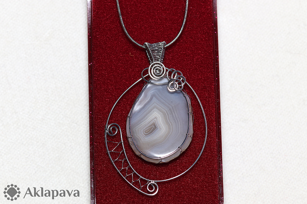 PM425Náhrdelník s minerálem achátem z české lokality Nová/Stará Paka. Šperk je drátkovaný chirurgickou ocelí (AISI316L). Zavěšen je na nádherném hadím řetízku z potravinářské oceli (AISI304). Více o achátu (fakta, esoterika, zajímavosti z historie) v článku na blogu: aklapava.cz/blog/2016/12/achat/