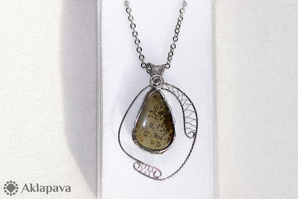 PM313Náhrdelník s minerálem porcelanitem z Česka. Náhrdelník je drátkován ocelí 316L (chirurgická), zavěšen na řetízku z oceli 304 (potravinářská). Podle esoteriky porcelanit podporuje kreativitu, inspiraci a koncentraci. Napomáhá k dokončení plánů. Je vhodným kamenem pro umělce. Podle astrologie je nejvhodnějším kamenem pro znamení: býk, lev, panna, kozoroh. Více o porcelanitu na blogu: aklapava.cz/blog/2019/01/porcelanit/