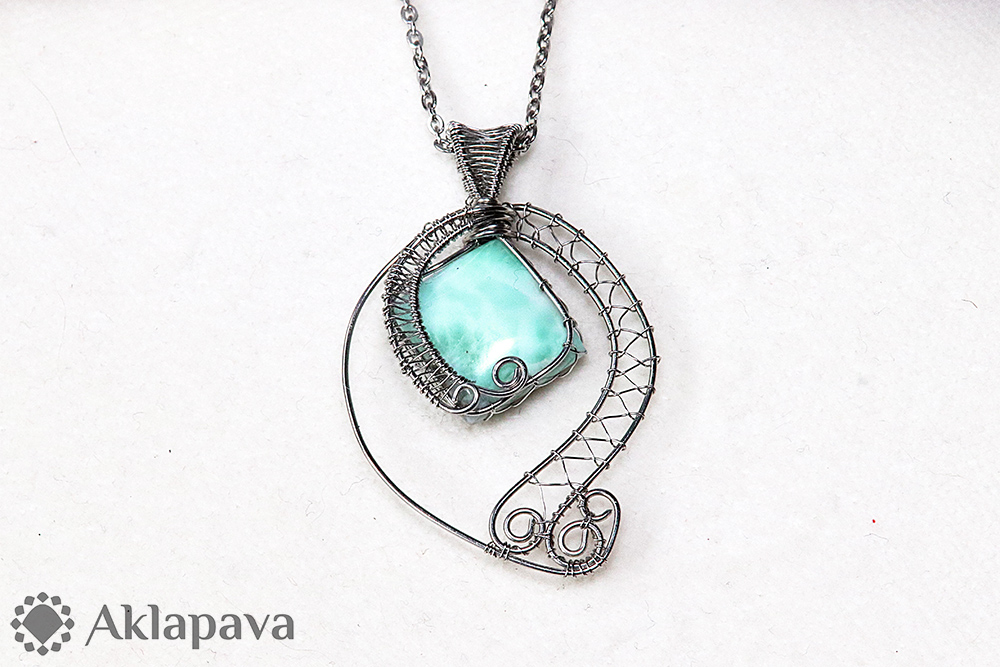 PM339Náhrdelník se vzácným minerálem larimarem (1,77 g), jehož jediné naleziště se nachází v Dominikánské republice v lomu zvaném Los Chupaderos, asi 10 m jižně od města Barahona. Drátek z nerezové oceli 316L (tzv. chirurgická či švédská). Zavěšen na řetízku z nerezové oceli 304 (potravinářská). Více o larimaru (fakta, esoterika, historie) se můžete dočíst na našem blogu: aklapava.cz/blog/2024/10/larimar/