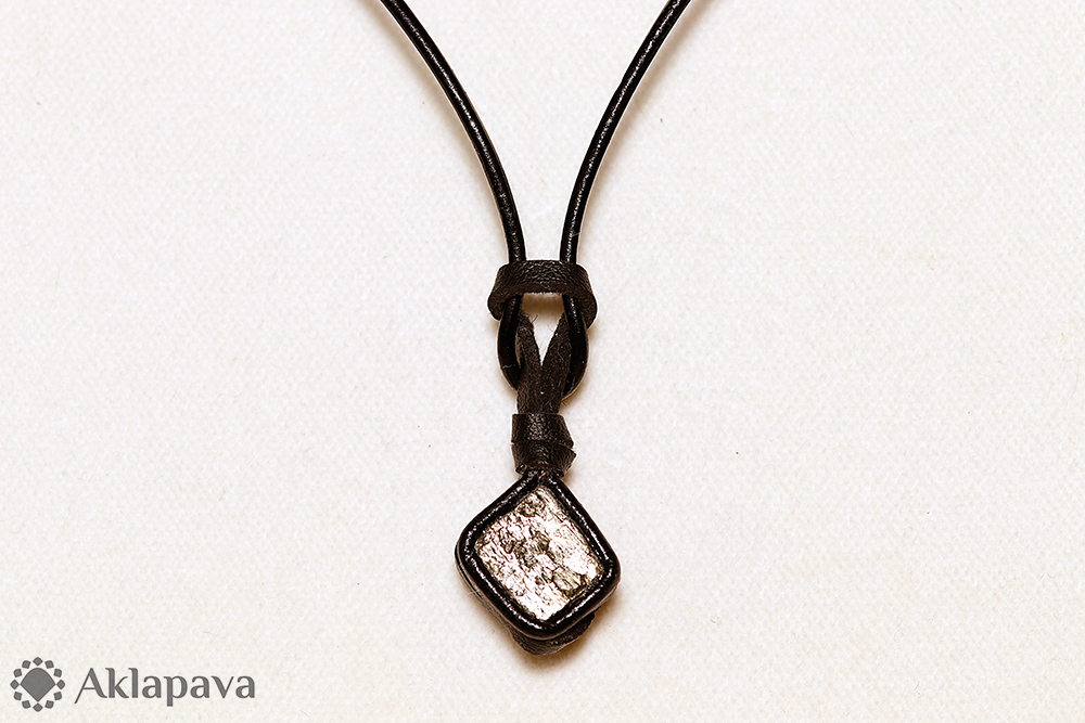PM399Náhrdelník s minerálem pyritem z Číny. Pyrit je lakovaný, aby se zabránilo zvětrávání a pyrit neztratil svůj zlatý lesk, tzv. neoslepl. Foto je ilustrativní, kámen může mít nepatrně jinou strukturu. Vsazen a zavěšen na kůži. Více o pyritu (fakta, esoterika, historie) se můžete dočíst na našem blogu: aklapava.cz/blog/2022/01/pyrit/