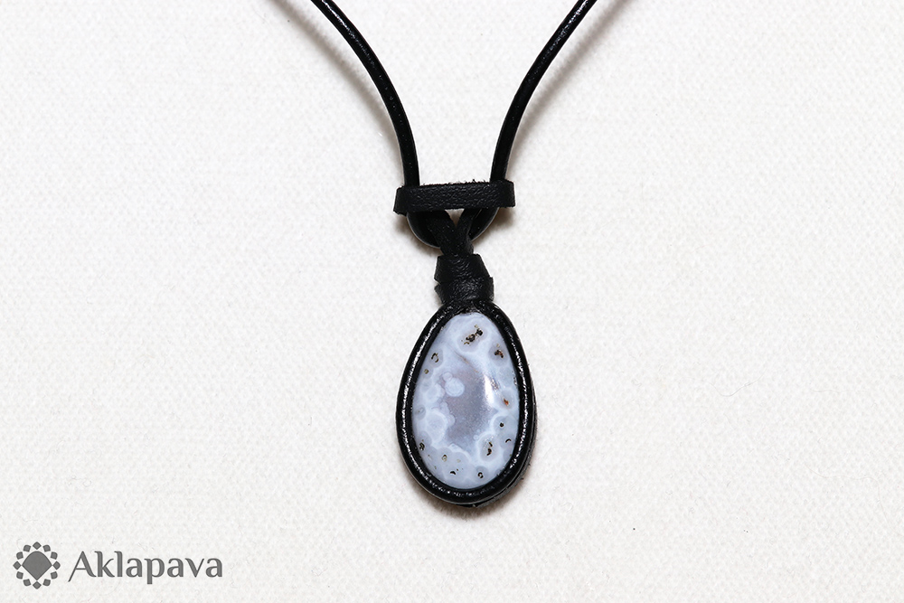 PM434Achát z české lokality Rašovka vsazen v kůži. Náhrdelník je zavěšen na pravé lakované kulaté kůži s ocelovým zapínáním na karabinku. Podle esoteriky dodává achát odvahu, pocit jistoty a bezpečí. Více o achátu na blogu: https://www.aklapava.cz/blog/2016/12/achat/