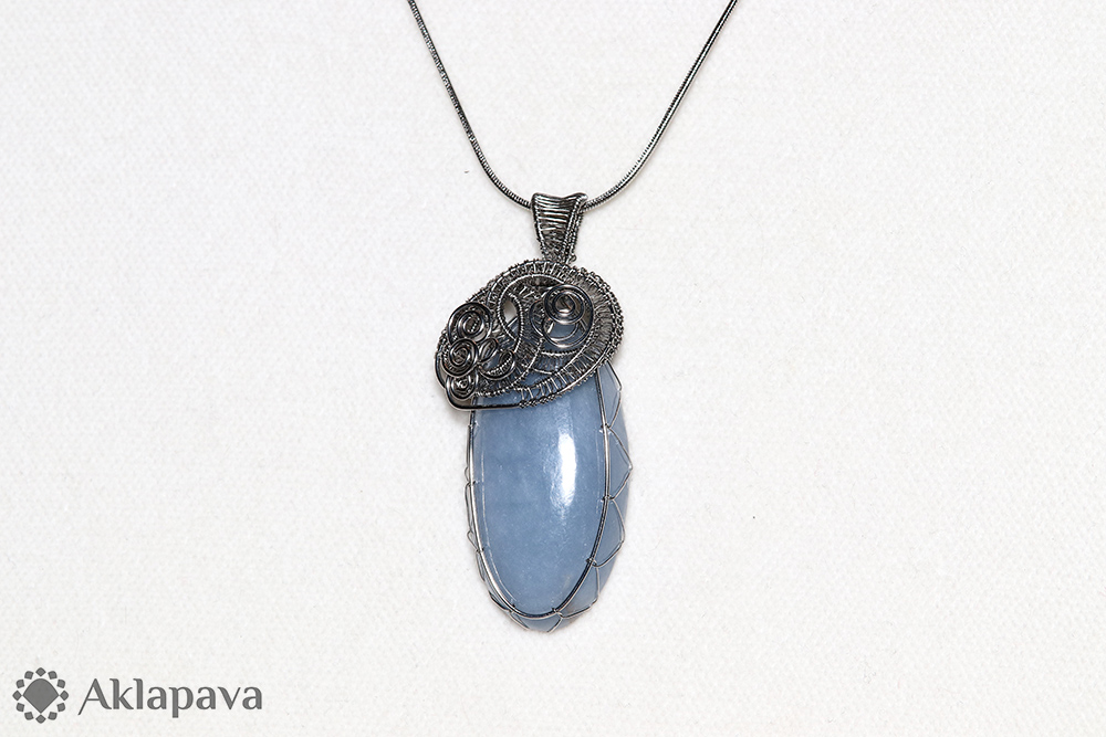 Náhrdelník s kamenem angelitem drátkovaný nerezovou ocelí 316L (tzv. chirurgická či švédská). Šperk je zavěšen na hadím řetízku z nerezové oceli 304. Podle esoteriky prý angelit navozuje pocit klidu a míru. Více o angelitu na blogu: aklapava.cz/blog/2021/01/angelit/