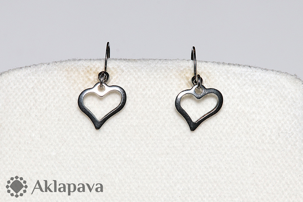 Náušnice ve tvaru malých srdíček. Háčky z oceli 316L (chirurgická) opatřeny silikonovými zarážkami. Srdíčka z oceli 304.