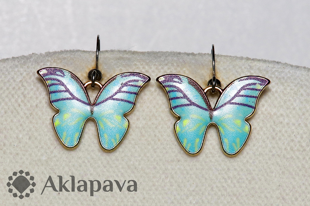 BO021Kovové náušnice ve tvaru motýlů. Háčky antialergenní z oceli AISI 316L (tzv. chirurgická či švédská) opatřeny silikonovými zarážkami. Ideální náušnice pro jarní a letní období pro malé i velké.