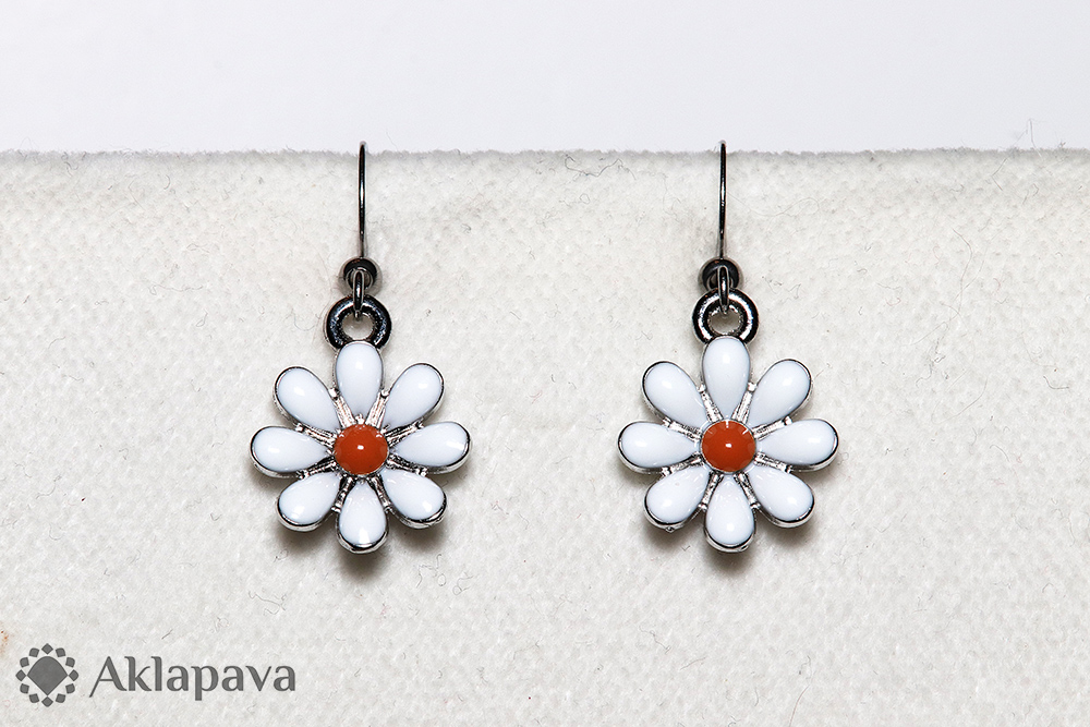 BO029Kovové náušnice ve tvaru květin zavěšených na háčcích z nerezové oceli AISI 316L (chirurgická), opatřených silikonovými zarážkami proti vypadnutí náušnice.