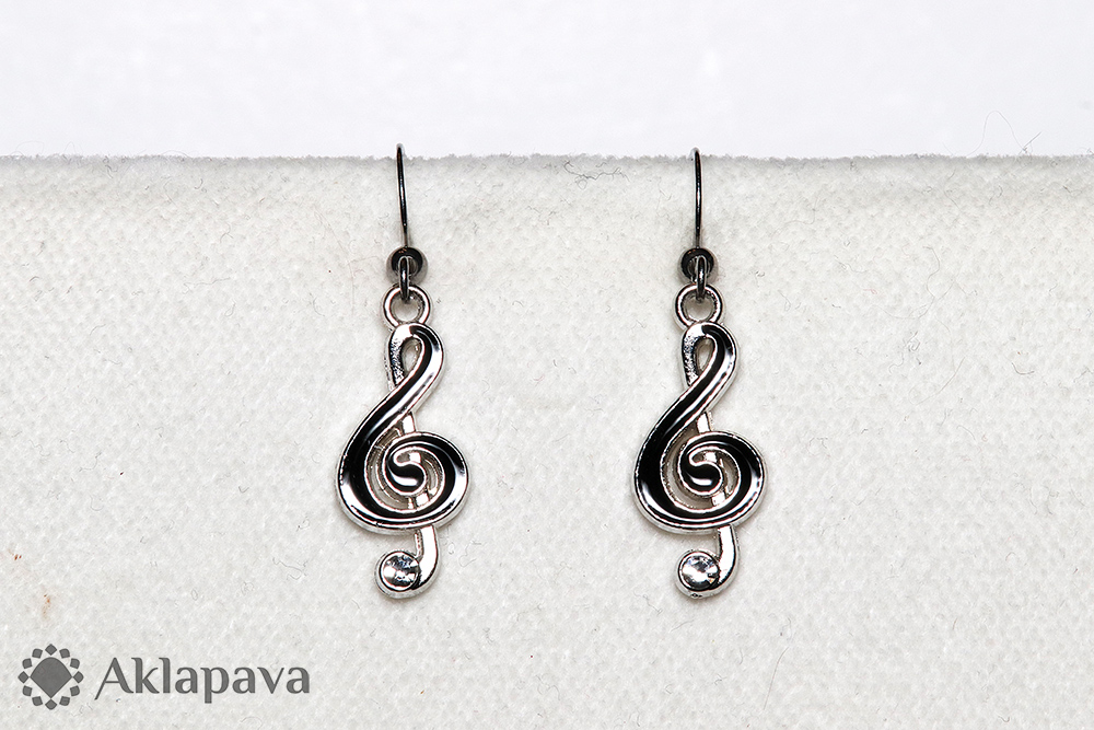 BO030Kovové náušnice ve tvaru houslového klíče (ve spodní části s malým čirým kamínkem) zavěšených na háčcích z nerezové oceli AISI 316L (chirurgická), opatřených silikonovými zarážkami proti vypadnutí náušnice.