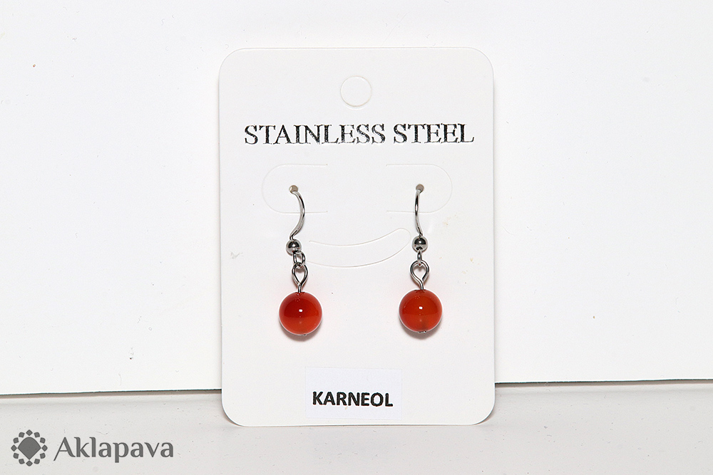 Náušnice s kuličkami minerálu karneolu. Háčky z oceli 316L (chirurgická) se silikonovými zarážkami. Více o minerálech na blogu.