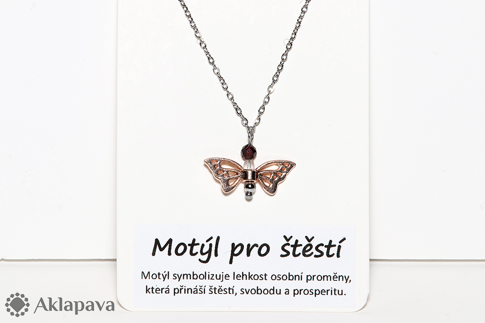 PM469Náhrdelník ve tvaru motýlka s minerálem granátem. Křídla ze zinkové slitiny, ostatní komponenty včetně řetízku z nerezové oceli 304. Motýl symbolizuje lehkost osobní proměny, která přináší štěstí, svobodu a prosperitu.