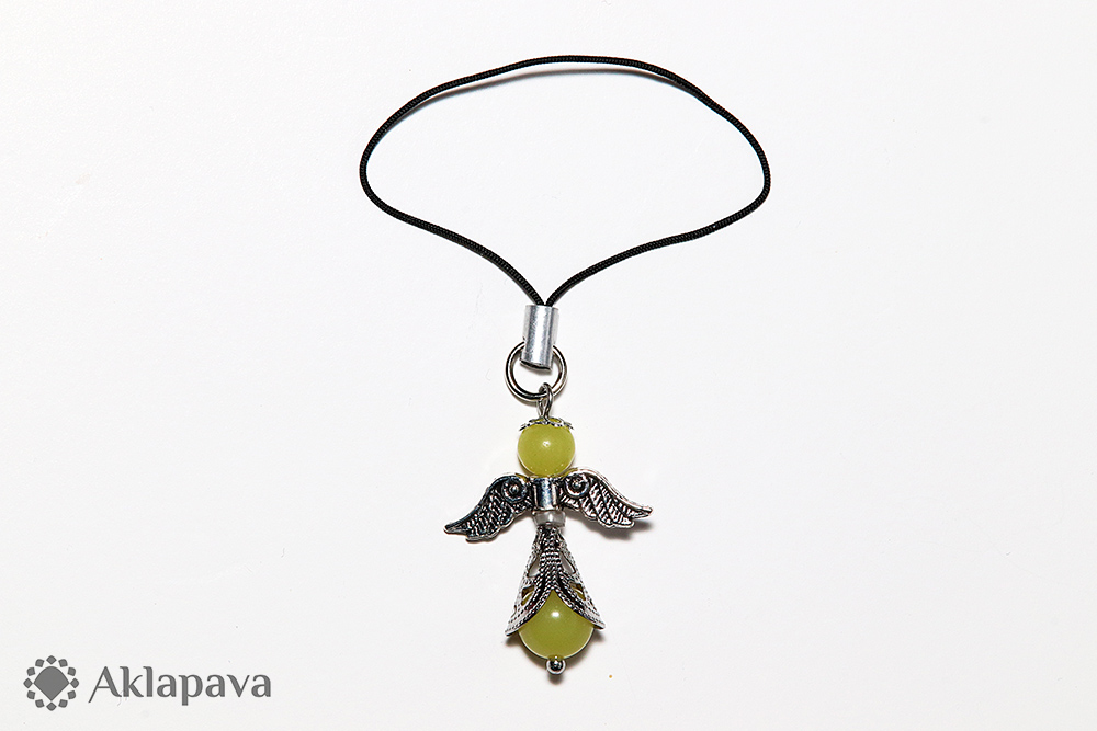 PR037Přívěsek ve tvaru andělíčka s minerálem citrónovým jadeitem. Anděl je zavěšen na šňůrce, tzv. liščí smyčkou jej lze jednoduše připevnit např. ke kabelce, batohu, zipu na oblečení, penálu, mobilu apod. nebo jej za šňůrku pověsit doma jako dekoraci. Křídla jsou ze zinkové slitiny, sukýnka je z nerezové oceli 316L. Anděl je symbolem ochrany před zlem, přináší štěstí, dodává odvahu a novou energii.