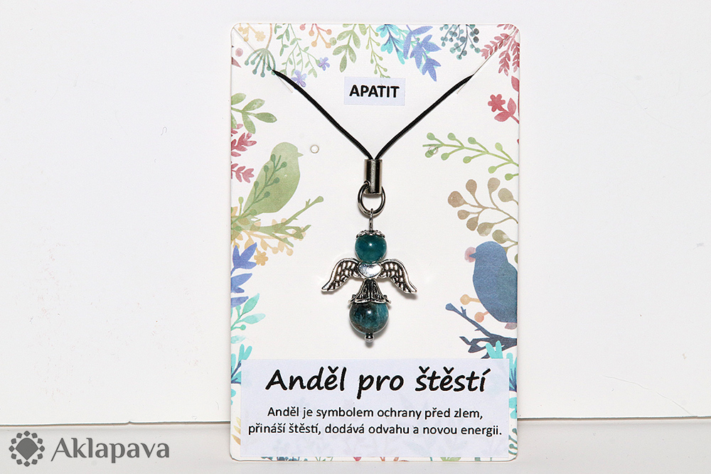 Přívěsek ve tvaru andělíčka s minerálem apatitem. Anděl je zavěšen na šňůrce, tzv. liščí smyčkou jej lze jednoduše připevnit např. ke kabelce, batohu, zipu na oblečení, penálu, mobilu apod. nebo jej za šňůrku pověsit doma jako dekoraci. Křídla i sukýnka jsou ze zinkové slitiny. Anděl je symbolem ochrany před zlem, přináší štěstí, dodává odvahu a novou energii.