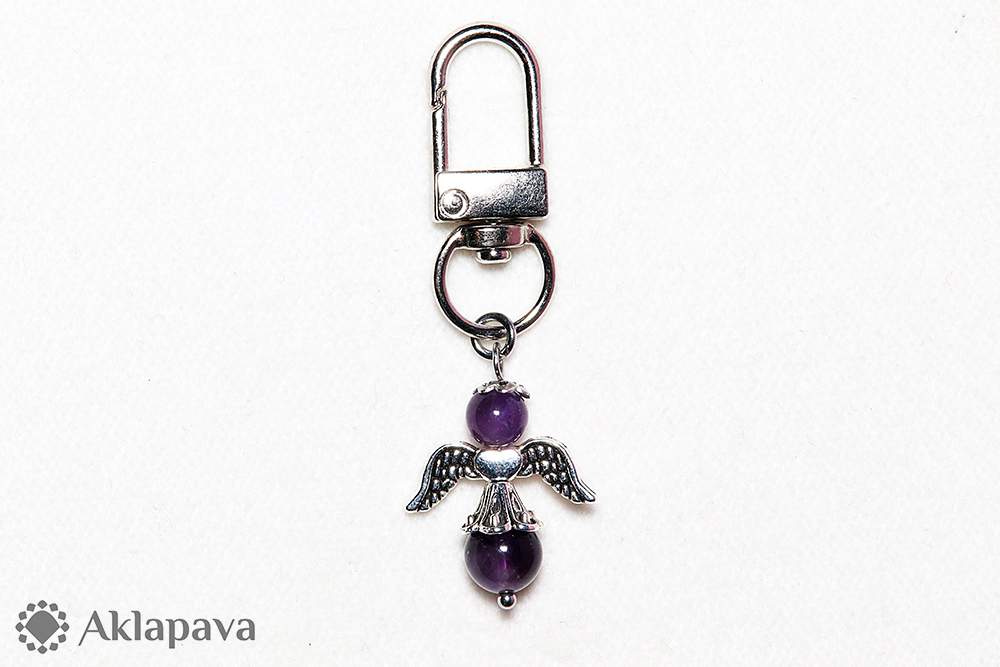PR043Přívěsek ve tvaru andělíčka s minerálem ametystem. Anděl je zavěšen na karabince, pomocí které lze andílka jednoduše připevnit např. ke kabelce, batohu, klíčům apod. Křídla i sukýnka jsou ze zinkové slitiny. Anděl je symbolem ochrany před zlem, přináší štěstí, dodává odvahu a novou energii.