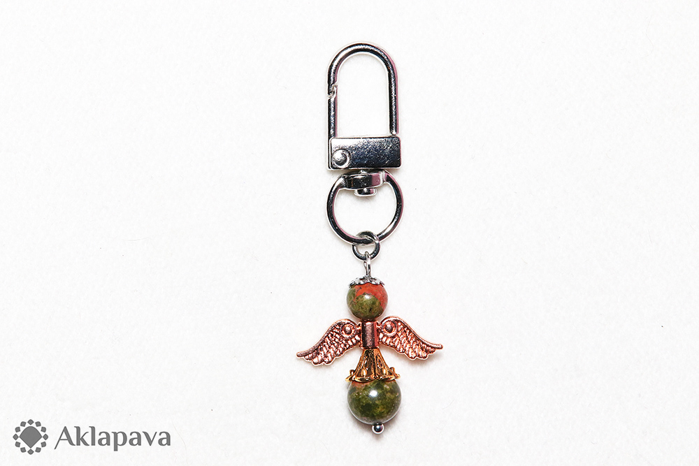 PR046Přívěsek ve tvaru andělíčka s minerálem unakitem. Anděl je zavěšen na karabince, pomocí které lze andílka jednoduše připevnit např. ke kabelce, batohu, klíčům apod. Křídla i sukýnka jsou ze zinkové slitiny. Anděl je symbolem ochrany před zlem, přináší štěstí, dodává odvahu a novou energii.