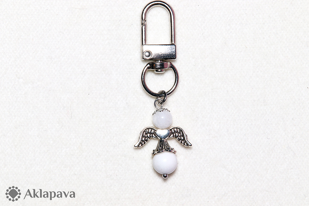 PR047Přívěsek ve tvaru andělíčka s minerálem malajským jadeitem. Anděl je zavěšen na karabince, pomocí které lze andílka jednoduše připevnit např. ke kabelce, batohu, klíčům apod. Křídla i sukýnka jsou ze zinkové slitiny. Anděl je symbolem ochrany před zlem, přináší štěstí, dodává odvahu a novou energii.