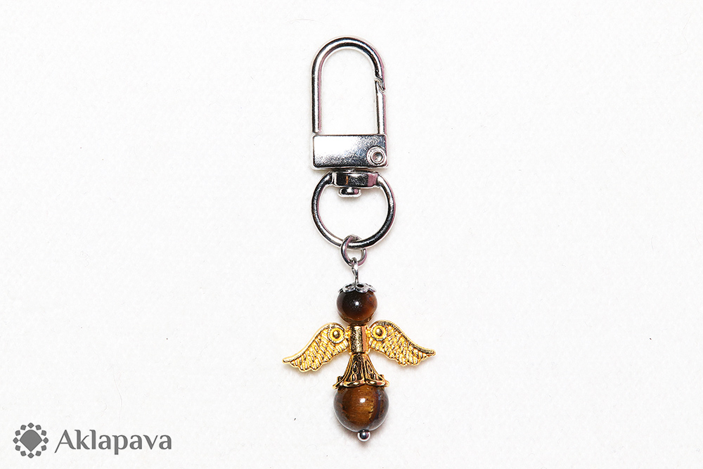 PR049Přívěsek ve tvaru andělíčka s minerálem tygřím okem. Anděl je zavěšen na karabince, pomocí které lze andílka jednoduše připevnit např. ke kabelce, batohu, klíčům apod. Křídla i sukýnka jsou ze zinkové slitiny. Anděl je symbolem ochrany před zlem, přináší štěstí, dodává odvahu a novou energii.