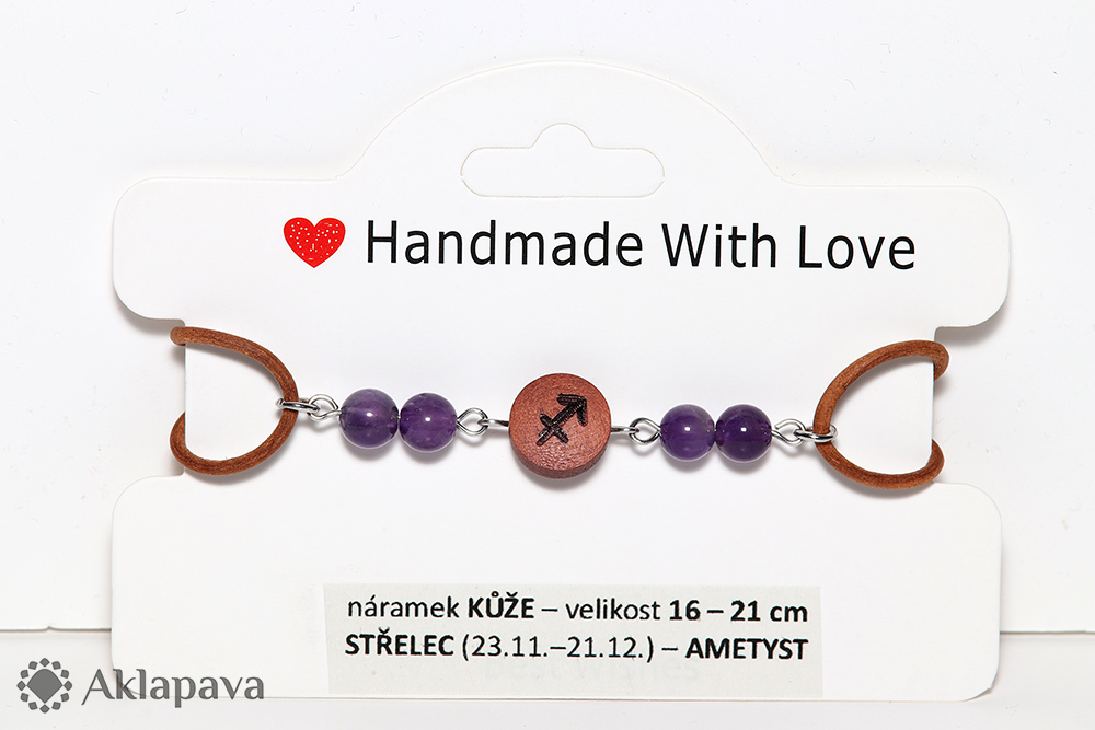 CM093Náramek z pravé kulaté kůže s minerálními kuličkami ametystu a s dřevěným znakem střelce. Kovové komponenty jsou z nerezové oceli 304. Náramek se zatahuje a povoluje posouváním kůže v uzlíku. Univerzální velikost. Foto ilustrační, každý kus může mít jinou intenzitu barvy kuliček minerálu.