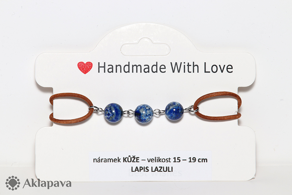 CM100Náramek z pravé kulaté kůže s kuličkami lapisu lazuli. Kovové komponenty jsou z nerezové oceli 304. Náramek se zatahuje a povoluje posouváním kůže v uzlíku. Velikost pro starší děti a dospělé s užším zápěstím.