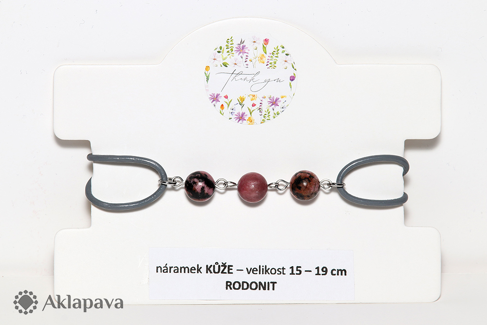 Náramek z pravé lakované kulaté kůže s kuličkami minerálu rodonitu. Kovové komponenty jsou z nerezové oceli 304. Náramek se zatahuje a povoluje posouváním kůže v uzlíku. Velikost pro starší děti a dospělé s užším zápěstím.