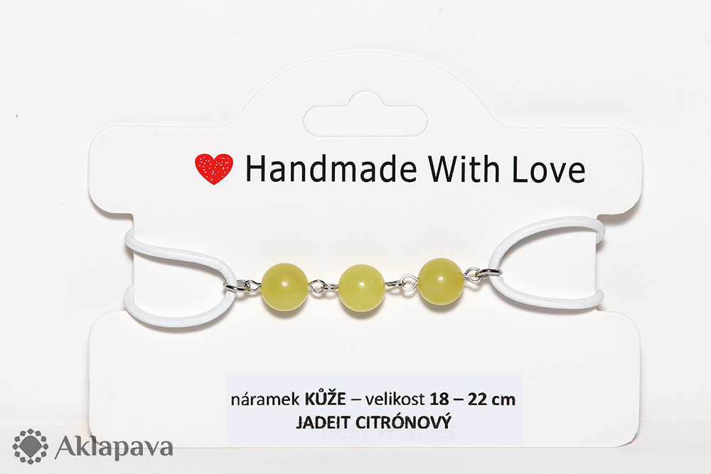 CM113Náramek z pravé lakované kulaté kůže s kuličkami minerálu citrónového jadeitu. Kovové komponenty jsou z nerezové oceli 304. Náramek se zatahuje a povoluje posouváním kůže v uzlíku. Velikost pro dospělé s běžným a větším zápěstím. Foto ilustrační, každý kus může mít jinou intenzitu barvy kuliček minerálu.