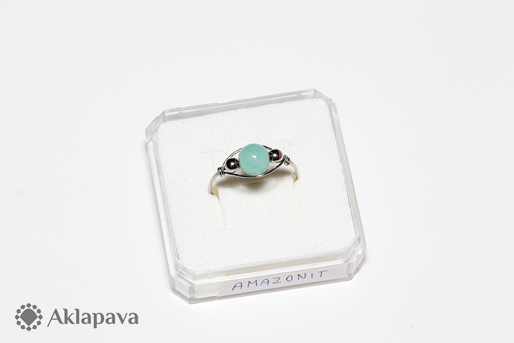 DC008Drátkovaný prstýnek s amazonitem. Drát a drobné korálky jsou z antialergenní nerezové oceli 316L - tzv. chirurgická. Prstýnek uložen v krabičce. Foto ilustrační, kámen může mít různou intenzitu barvy.