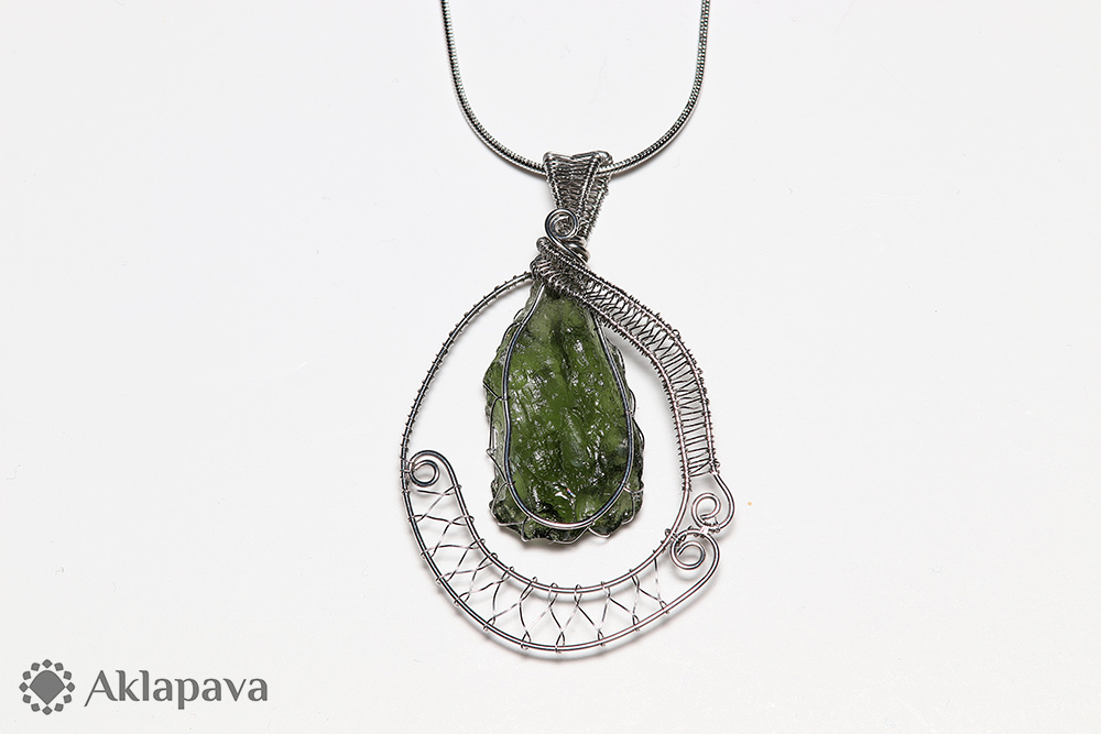 PM474Minerál vltavín o váze 2,2 g z Česka. Drátkovaný nerezovou ocelí 316L (chirurgická). Zavěšen na krásném hadím řetízku z oceli 304. Podle esoteriky je to prý kámen štěstí, hojnosti a plodnosti. Více o vltavínu (fakta, esoterika, zajímavosti) se můžete dovědět na našem blogu v rubrice Minerály.
