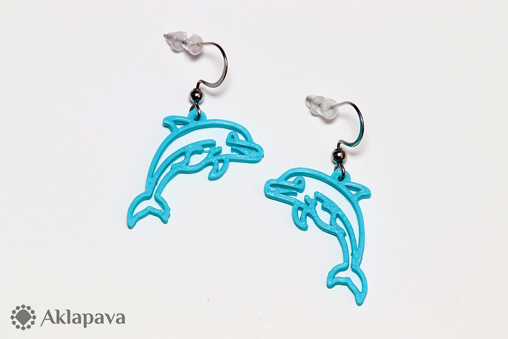 BT005Náušnice z 3D tiskárny v podobě delfínů. Vyrobeny z bioplastu PLA - polylaktidu. Ten se skládá z kyseliny mléčné, která se získává ze škrobu plodin jako je např. kukuřice, brambory, pšenice, maniok, cukrová třtina. Náušnice jsou zavěšeny na háčcích z nerezové oceli AISI 316L (tzv. chirurgická) a jsou opatřeny silikonovými zarážkami proti vypadnutí z ucha.