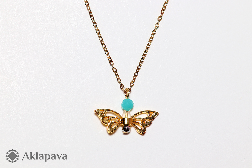 PM478Náhrdelník ve tvaru motýla s amazonitem. Řetízek z nerezové oceli, motýl zinková slitina. Motýl symbolizuje lehkost osobní proměny, která přináší štěstí, svobodu a prosperitu.