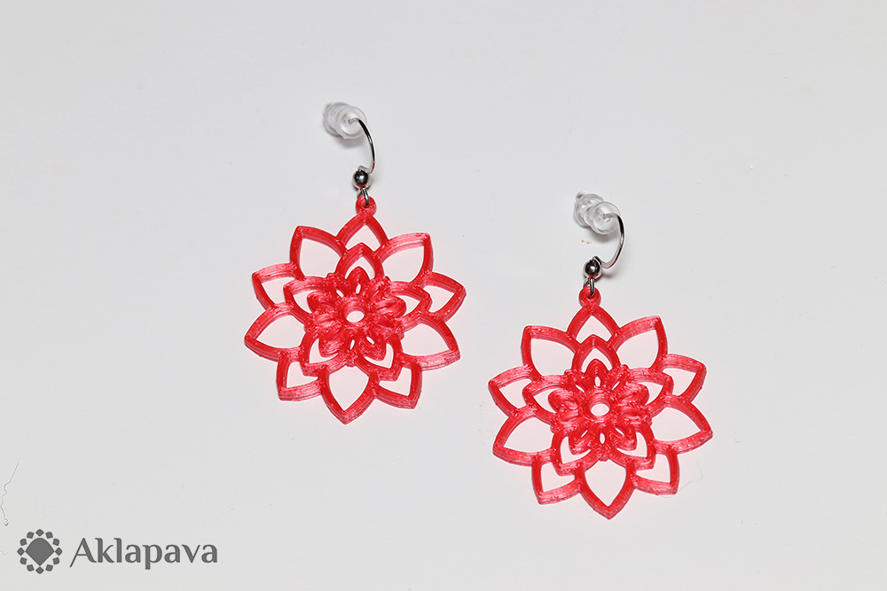 Náušnice z 3D tiskárny. Vyrobeny z bioplastu PLA - polylaktidu (s hedvábným leskem). Ten se skládá z kyseliny mléčné, která se získává ze škrobu plodin jako je např. kukuřice, brambory, pšenice, maniok, cukrová třtina. Náušnice jsou zavěšeny na háčcích z oceli 316L se silikonovými zarážkami.