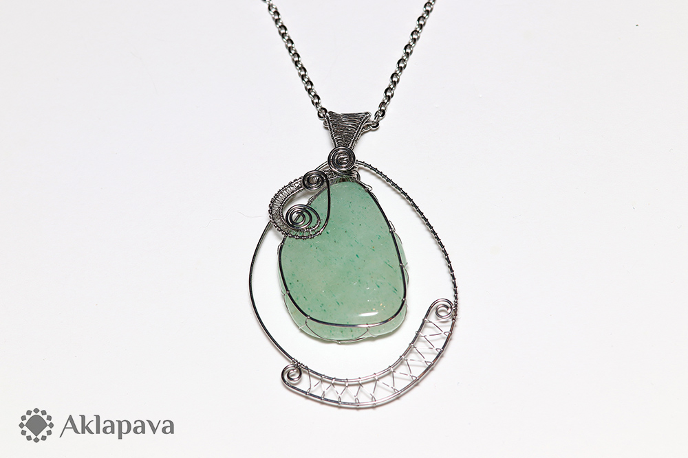 PM480Drátkovaný náhrdelník s minerálem avanturínem ze Zimbabwe. Drát - ocel 316L, řetízek - ocel 304. Zavěšen na kartě a uložen v sáčku. Podle esoteriky prý avanturín působí kladně na vše, co se týká prosperity a majetku. Posiluje řídící a rozhodovací schopnosti. Více o avanturínu na blogu: aklapava.cz/blog/2017/01/avanturin/