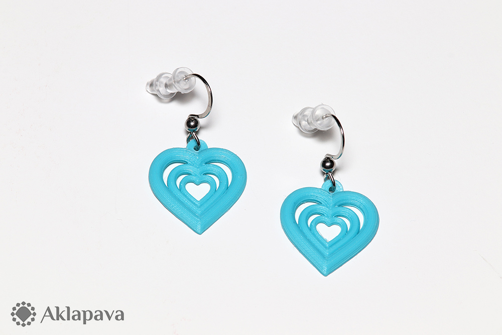 BT024Náušnice z 3D tiskárny v podobě srdíček. Vyrobeny z bioplastu PLA - polylaktidu. Ten se skládá z kyseliny mléčné, která se získává ze škrobu plodin jako je např. kukuřice, brambory, pšenice, maniok, cukrová třtina. Náušnice jsou zavěšeny na nerezových háčcích z oceli AISI 316L (tzv. chirurgická) a opatřeny silikonovými zarážkami proti vypadnutí.