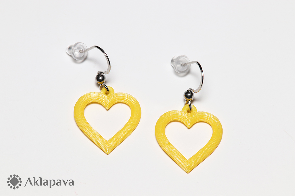 BT026Náušnice z 3D tiskárny v podobě srdíček. Vyrobeny z bioplastu PLA - polylaktidu. Ten se skládá z kyseliny mléčné, která se získává ze škrobu plodin jako je např. kukuřice, brambory, pšenice, maniok, cukrová třtina. Náušnice jsou zavěšeny na nerezových háčcích z oceli AISI 316L (tzv. chirurgická) a opatřeny silikonovými zarážkami proti vypadnutí.