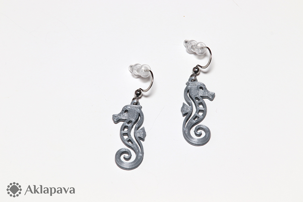 BT029Náušnice z 3D tiskárny v podobě kořských koníků. Vyrobeny z bioplastu PLA - polylaktidu (s hedvábným leskem). Ten se skládá z kyseliny mléčné, která se získává ze škrobu plodin jako je např. kukuřice, brambory, pšenice, maniok, cukrová třtina. Náušnice jsou zavěšeny na nerezových háčcích z oceli AISI 316L (tzv. chirurgická) a opatřeny silikonovými zarážkami proti vypadnutí.