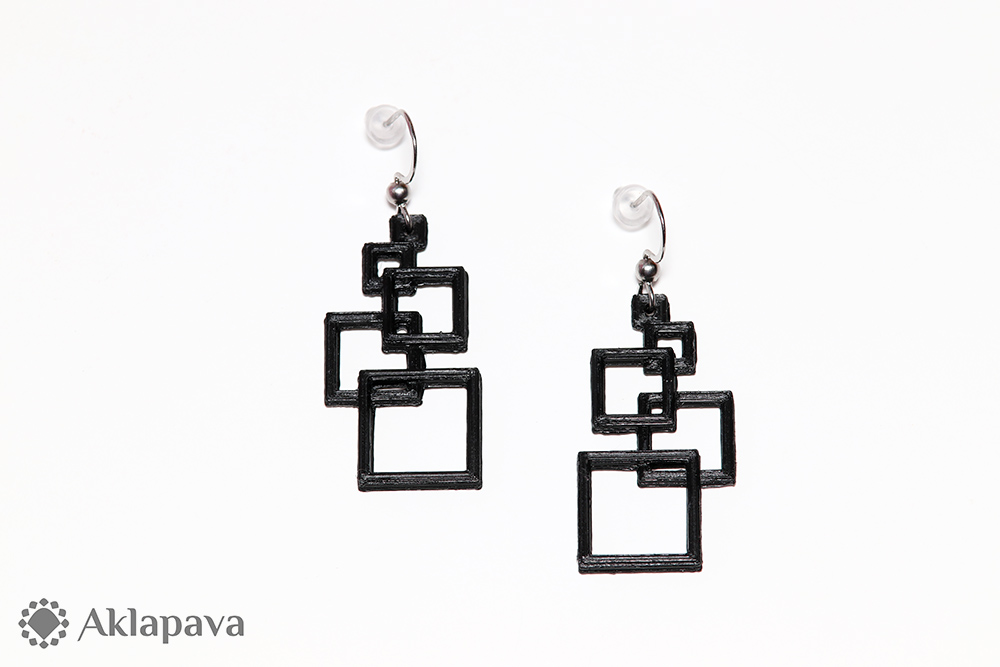 BT032Designové náušnice z 3D tiskárny v podobě čtverečků. Vyrobeny z bioplastu PLA - polylaktidu. Ten se skládá z kyseliny mléčné, která se získává ze škrobu plodin jako je např. kukuřice, brambory, pšenice, maniok, cukrová třtina. Náušnice jsou zavěšeny na nerezových háčcích z oceli AISI 316L (tzv. chirurgická) a opatřeny silikonovými zarážkami proti vypadnutí.