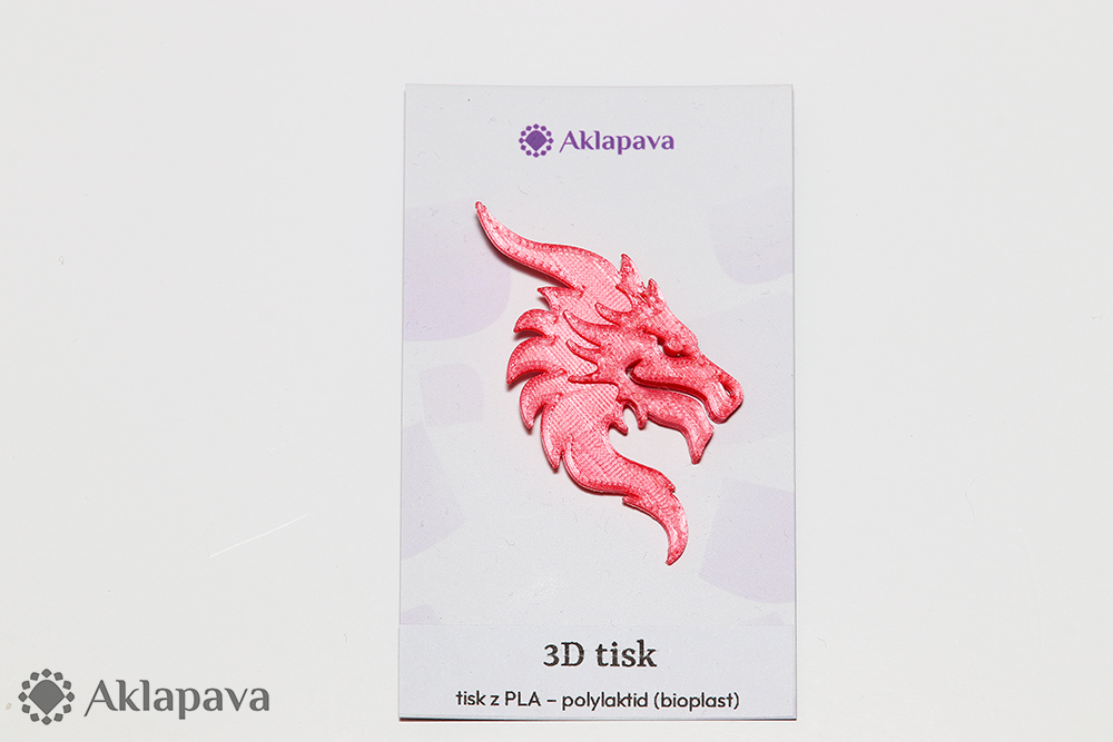 Brož z 3D tiskárny. Vyrobená z bioplastu PLA - polylaktidu (s hedvábným leskem). Ten se skládá z kyseliny mléčné, která se získává ze škrobu plodin jako je např. kukuřice, brambory, pšenice, maniok, cukrová třtina. Brož je na ocelovém můstku.