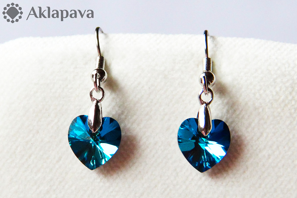 Náušnice s krystaly Swarovski elements ve tvaru srdíček tyrkysové barvy. Všechny komponenty ocelové. Háčky z chirurgické oceli se silikonovými zarážkami.