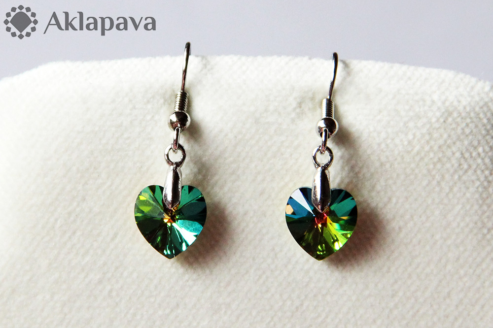 Náušnice s krystaly Swarovski elements ve tvaru srdíček. Všechny komponenty ocelové. Háčky z chirurgické oceli se silikonovými zarážkami.